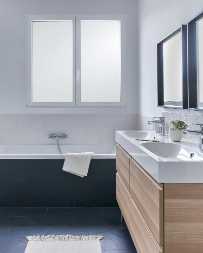 ? Ci-contre, une fenêtre de salle de bain équipée d’un vitrage dépoli acide qui laisse passer la lumière tout en protégeant des regards indiscrets.